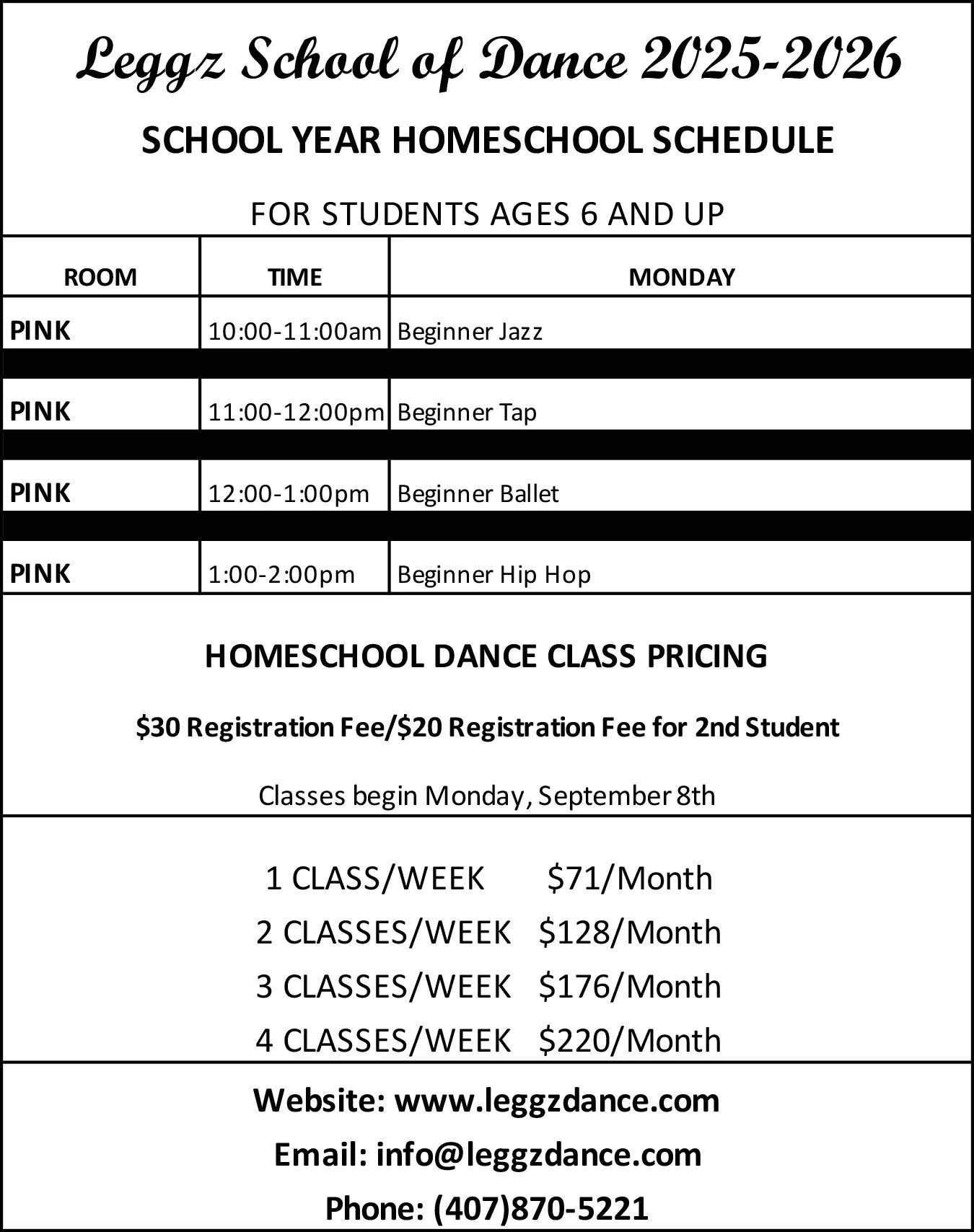 Leggz is proudly now offering morning classes to give homeschool students a chance to discover their love for dance! Classes are available for 6 years of age and up. Homeschool students will be eligible for our amazing end of season Leggz Recital to show off all of their new talent! Our morning class schedule is below - please feel free to contact us if you should have any questions at all!